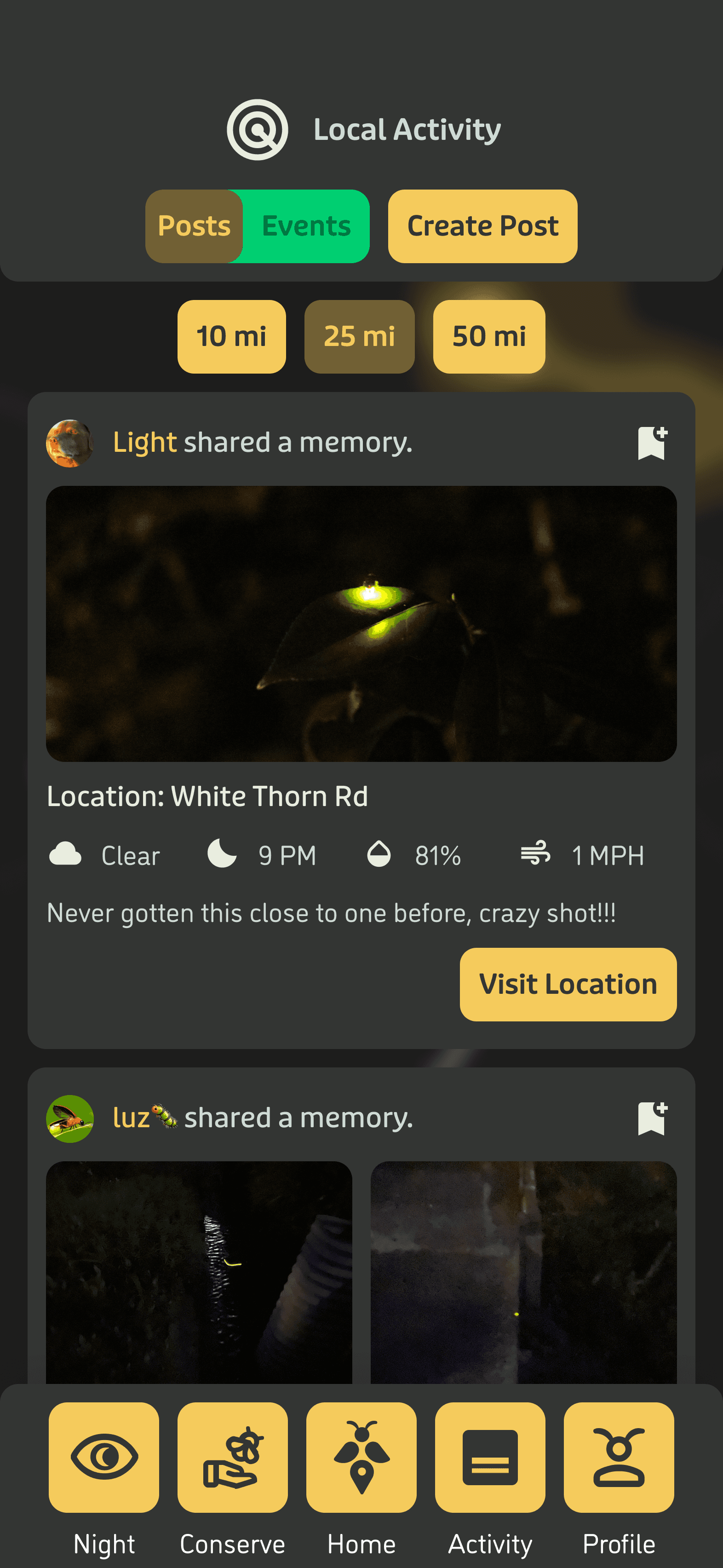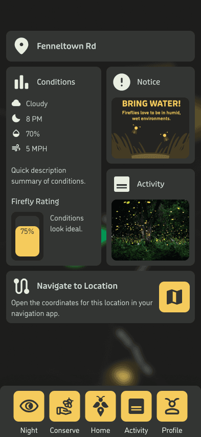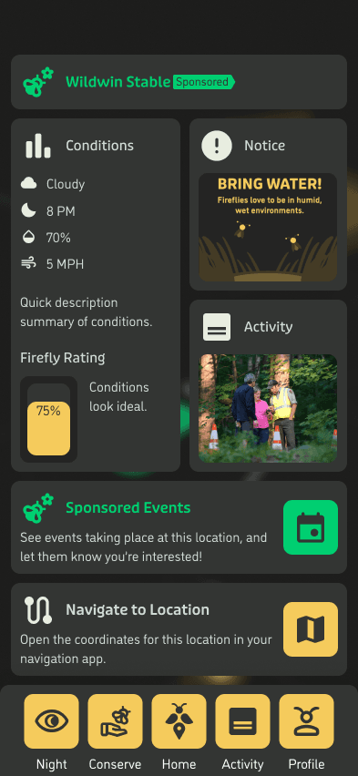 Lampyri is an application designed to help users discover and experience firefly habitats while prioritizing ethical conservation. By combining environmental data with community-sourced sightings, the app identifies ideal viewing conditions while educating users on how to protect these endangered insects. Lampyri also features sponsored locations, to promote safety and community among firefly fans.